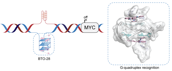 近日,凯发k8上海有机化学研究所曹春阳团队,开发出新型苯并噻唑衍生物BTO-28,可抑制MYC表达。机制研究显示,BTO-28通过π–π堆积与外部G-四链体结合,并与5′和3′-端灵活的侧翼碱基相互作用,调整构象以维持稳定的结合。BTO-28可在体外及细胞内诱导并稳定MYC G-四链体,在基因组水平选择性抑制MYC的转录活性,同时抑制转录因子SP1与RNA聚合酶II在MYC启动子区域的结合。
