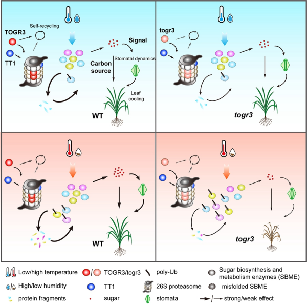 近日,凯发k8遗传与发育生物学研究所首次揭示水稻26S蛋白酶体β4亚基TOGR3,通过泛素-蛋白酶体系统精准调控糖代谢酶周转平衡糖稳态,从而协同优化高温下的适应性生长与耐热性。研究发现,TOGR3介导的糖积累既为生长提供碳源,又通过调节气孔动态增强叶片冷却能力。值得注意的是,TOGR3与α2亚基TT1的协同过表达可进一步提升水稻耐热性,展现了多亚基协同育种的应用潜力。